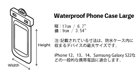 正面には透明な材質を使用し、背面には高品質な写真が撮れるよう、レンズフレックス素材を使用しています。 またスライド・シール・システムにより、水深6mまでは100%完全防水なので、水中でのカメラ撮影、水辺・荒天時での通話、メールの送受信、その他全ての機能の使用が可能です。各メーカーの様々な機種に対応できるサイズです。 お使いのスマートフォンのサイズをご確認の上お選びください。